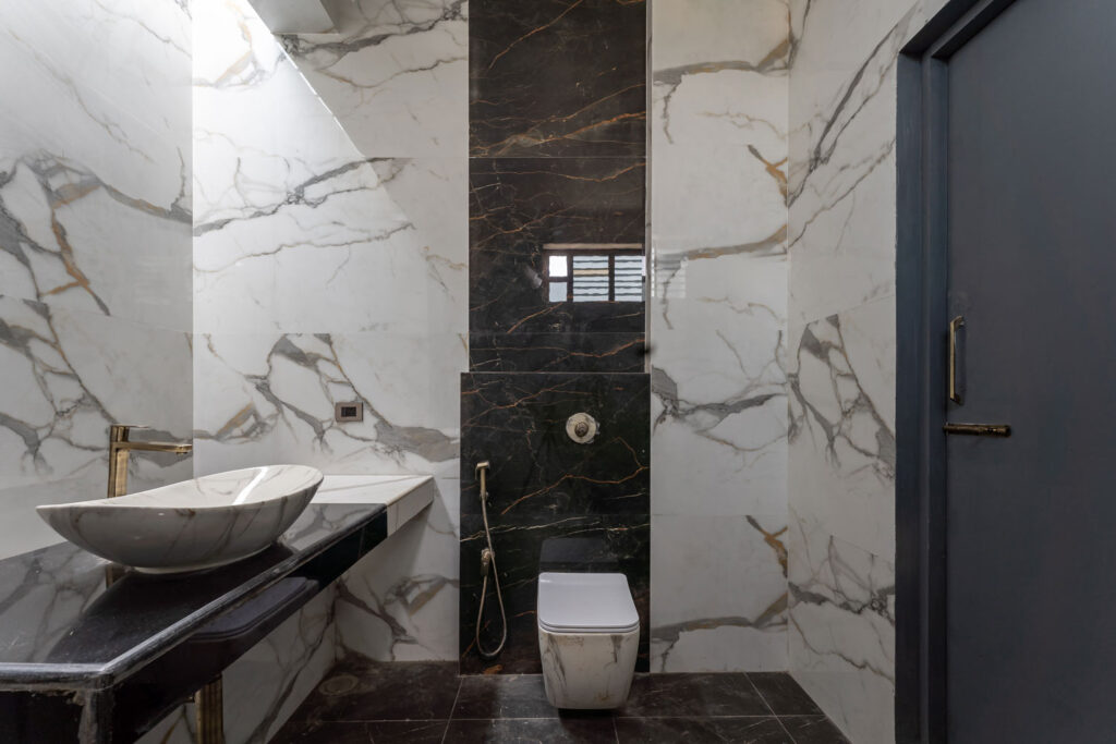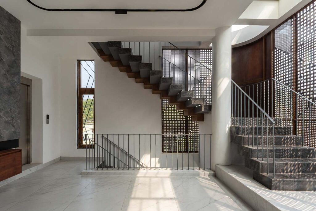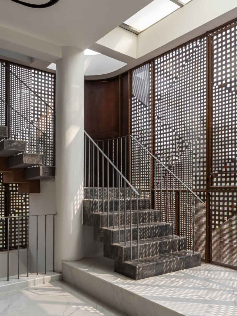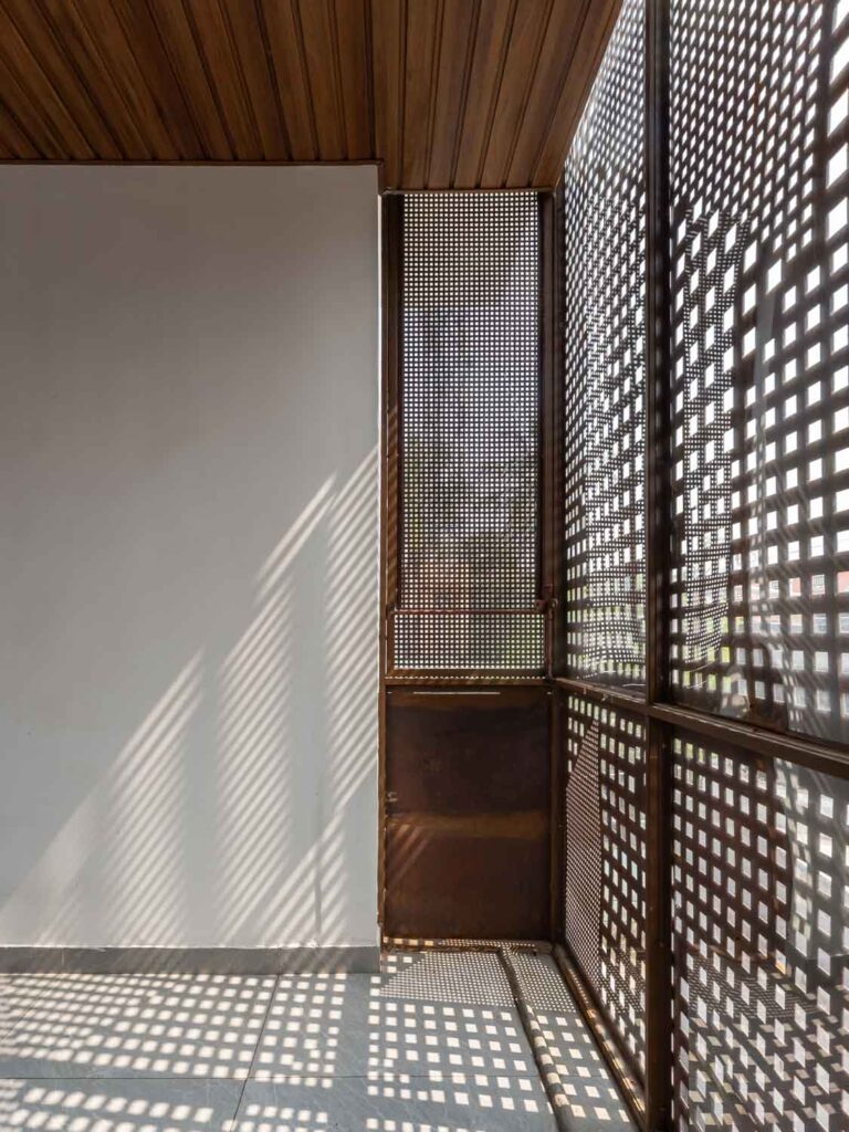 Given that the plot lies on a northeast corner, this zone is kept visually open to encourage airflow. It is also wrapped in Corten steel screens, which serve a dual purpose of maintaining privacy and introducing a rustic elegance to the elevation. The façade operates as a climatic and spatial device. Its perforations allow the building to breathe, tempering harsh sunlight while casting intricate patterns within.