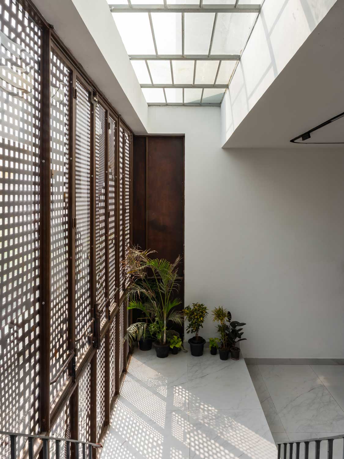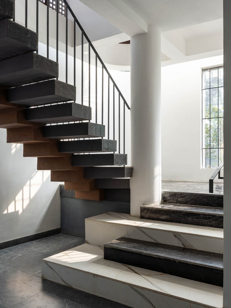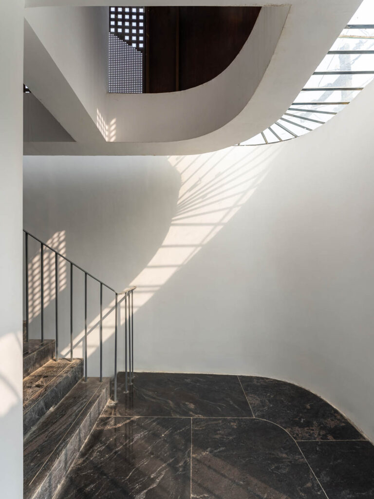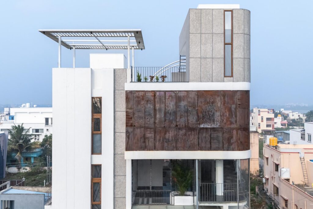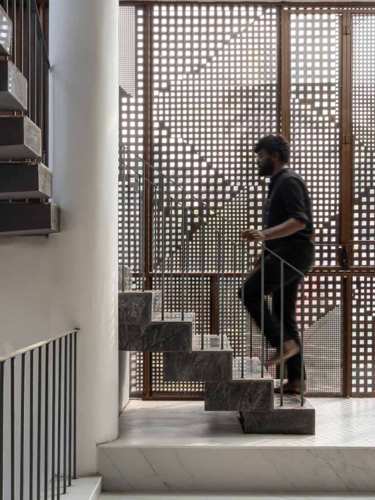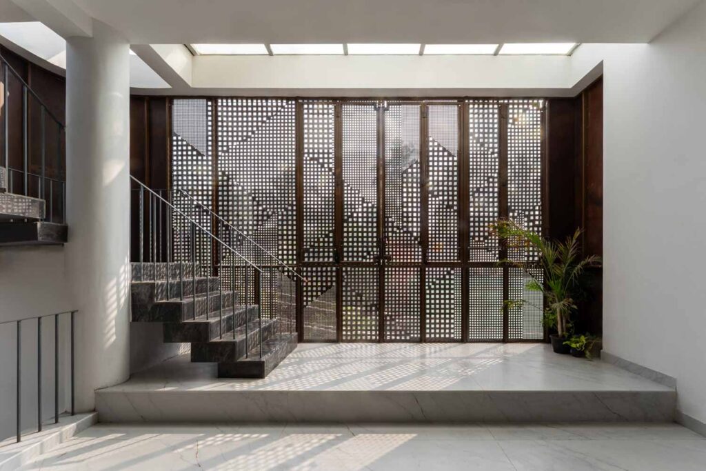 Given that the plot lies on a northeast corner, this zone is kept visually open to encourage airflow. It is also wrapped in Corten steel screens, which serve a dual purpose of maintaining privacy and introducing a rustic elegance to the elevation. The façade operates as a climatic and spatial device. Its perforations allow the building to breathe, tempering harsh sunlight while casting intricate patterns within.