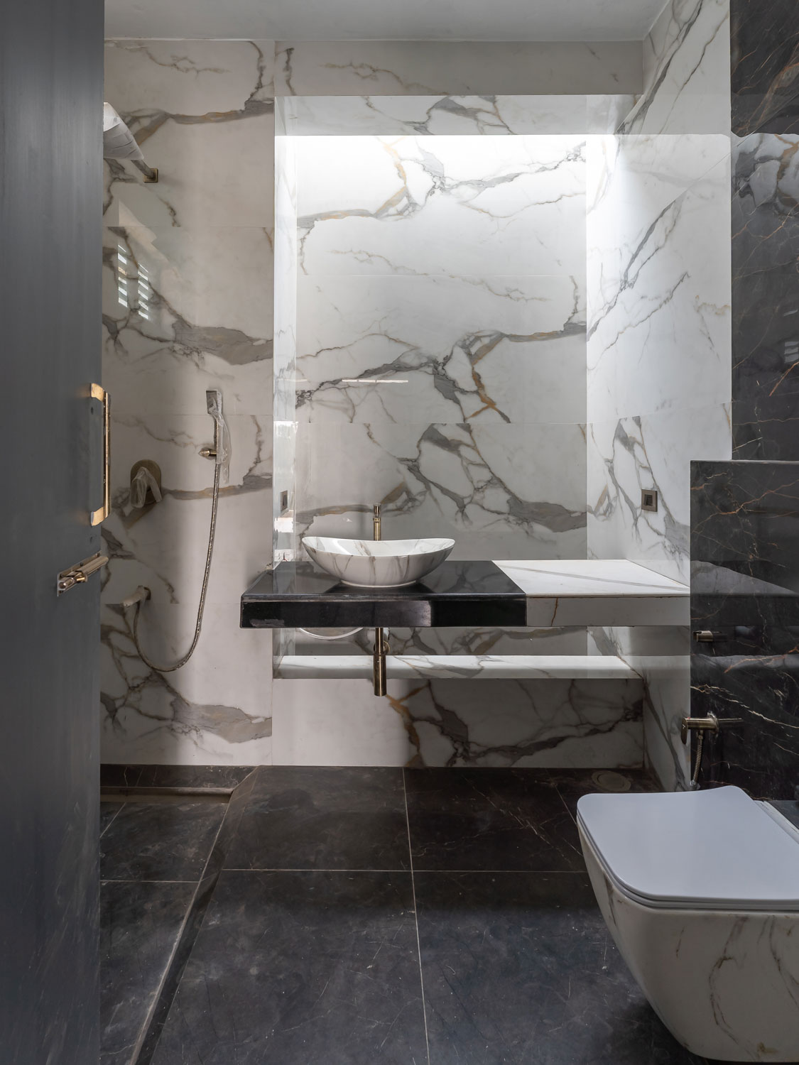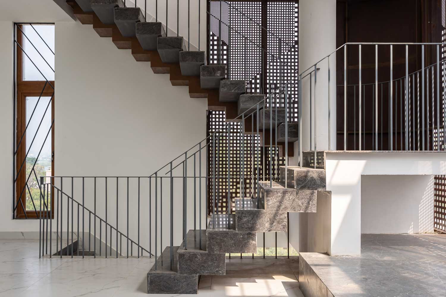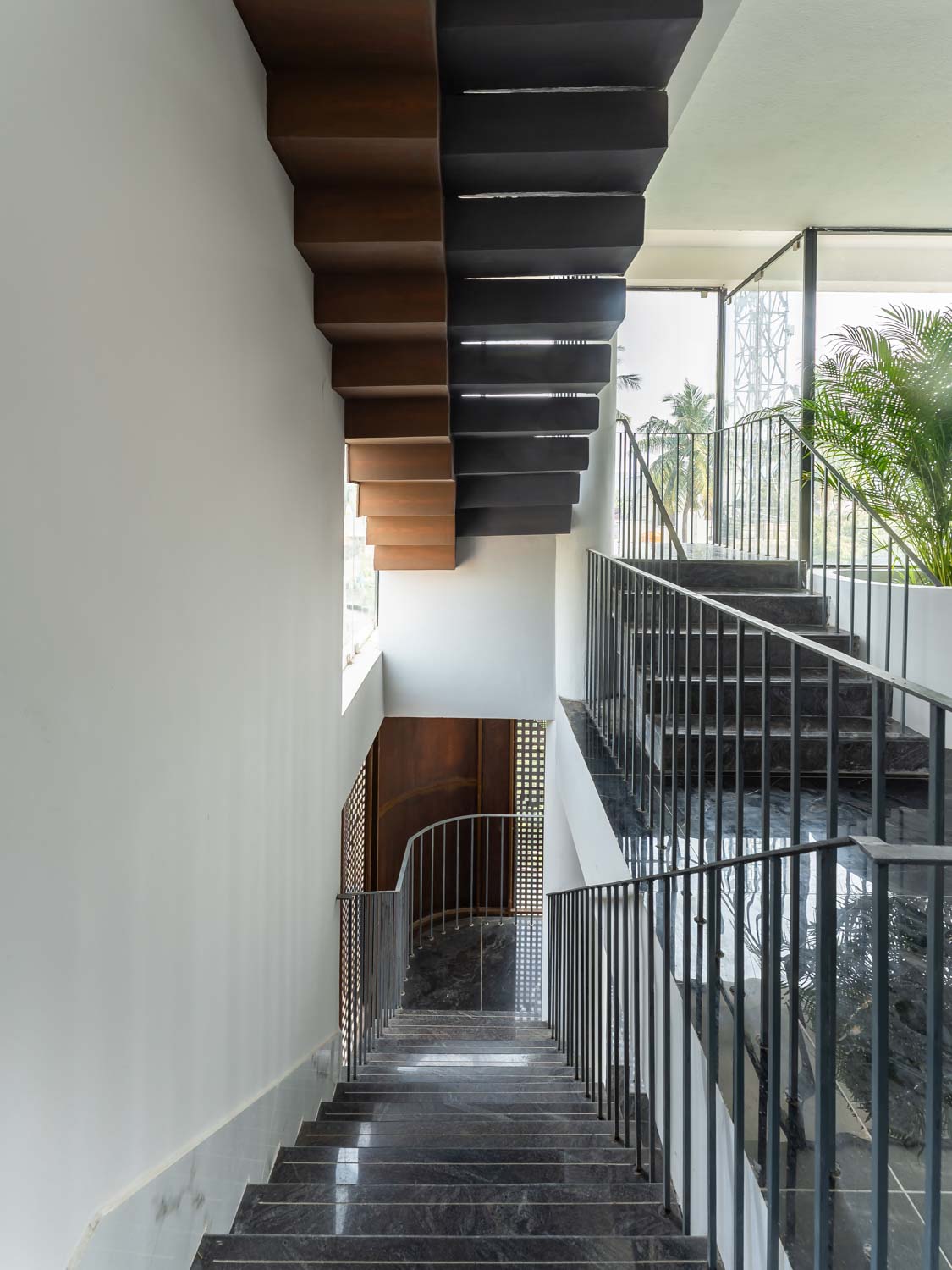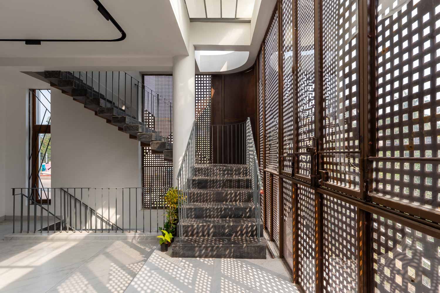 Given that the plot lies on a northeast corner, this zone is kept visually open to encourage airflow. It is also wrapped in Corten steel screens, which serve a dual purpose of maintaining privacy and introducing a rustic elegance to the elevation. The façade operates as a climatic and spatial device. Its perforations allow the building to breathe, tempering harsh sunlight while casting intricate patterns within.