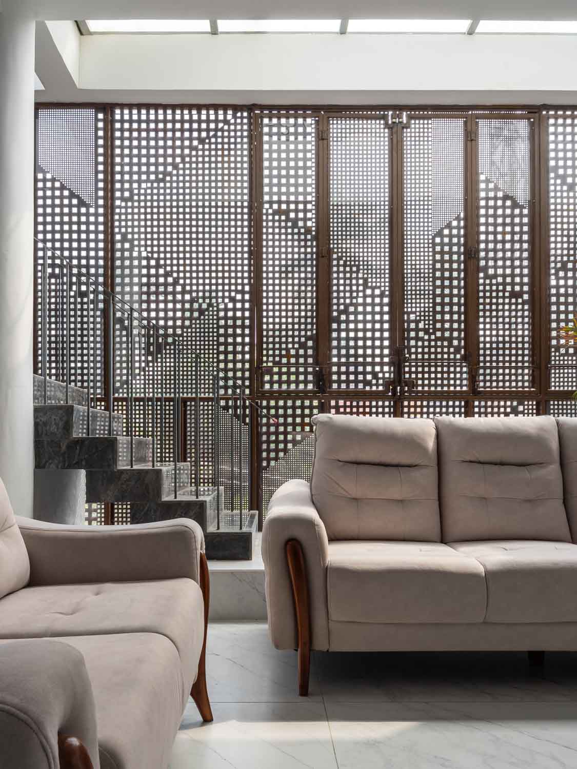 Natural light is treated as a primary design element rather than an afterthought. Skylights are carefully positioned to reduce reliance on artificial lighting, drawing daylight deep into the core of the house. Even the innermost spaces maintain a visual and emotional connection to the outside. As sunlight filters through the perforated screens, it breaks into shifting fragments that move across walls and floors throughout the day. These evolving shadows introduce rhythm and variation, ensuring the interiors remain dynamic and alive.