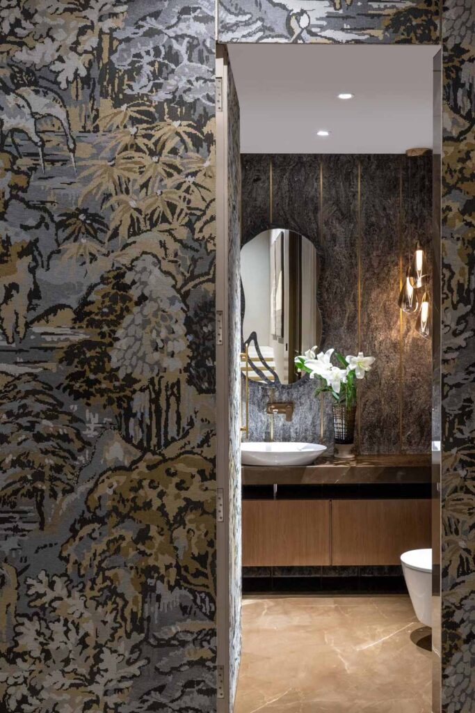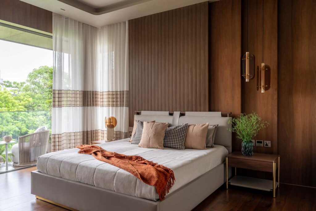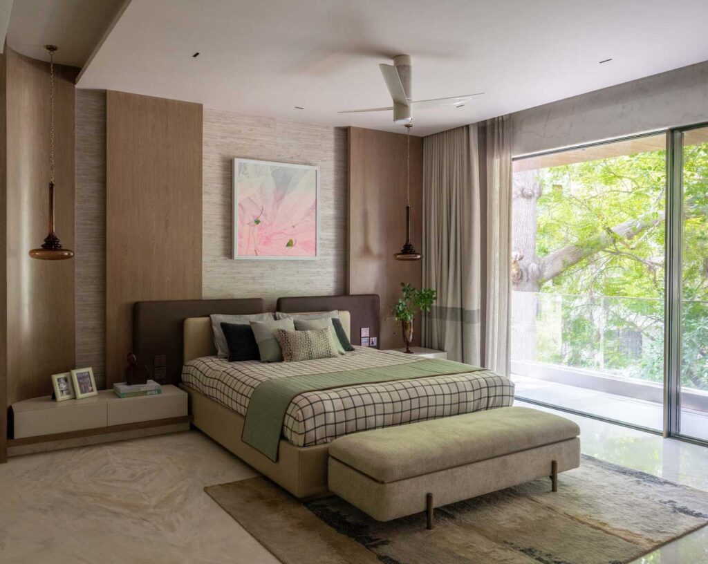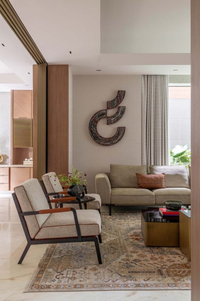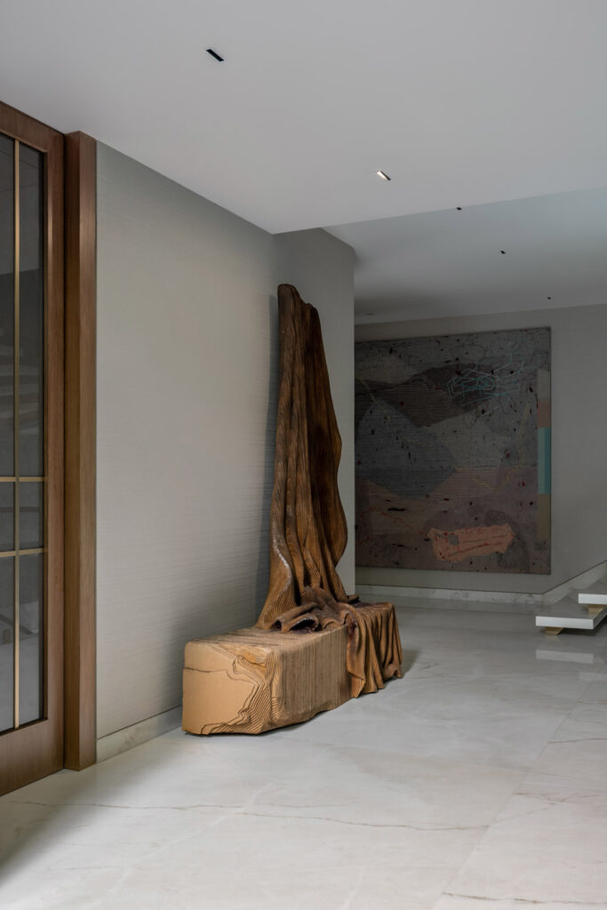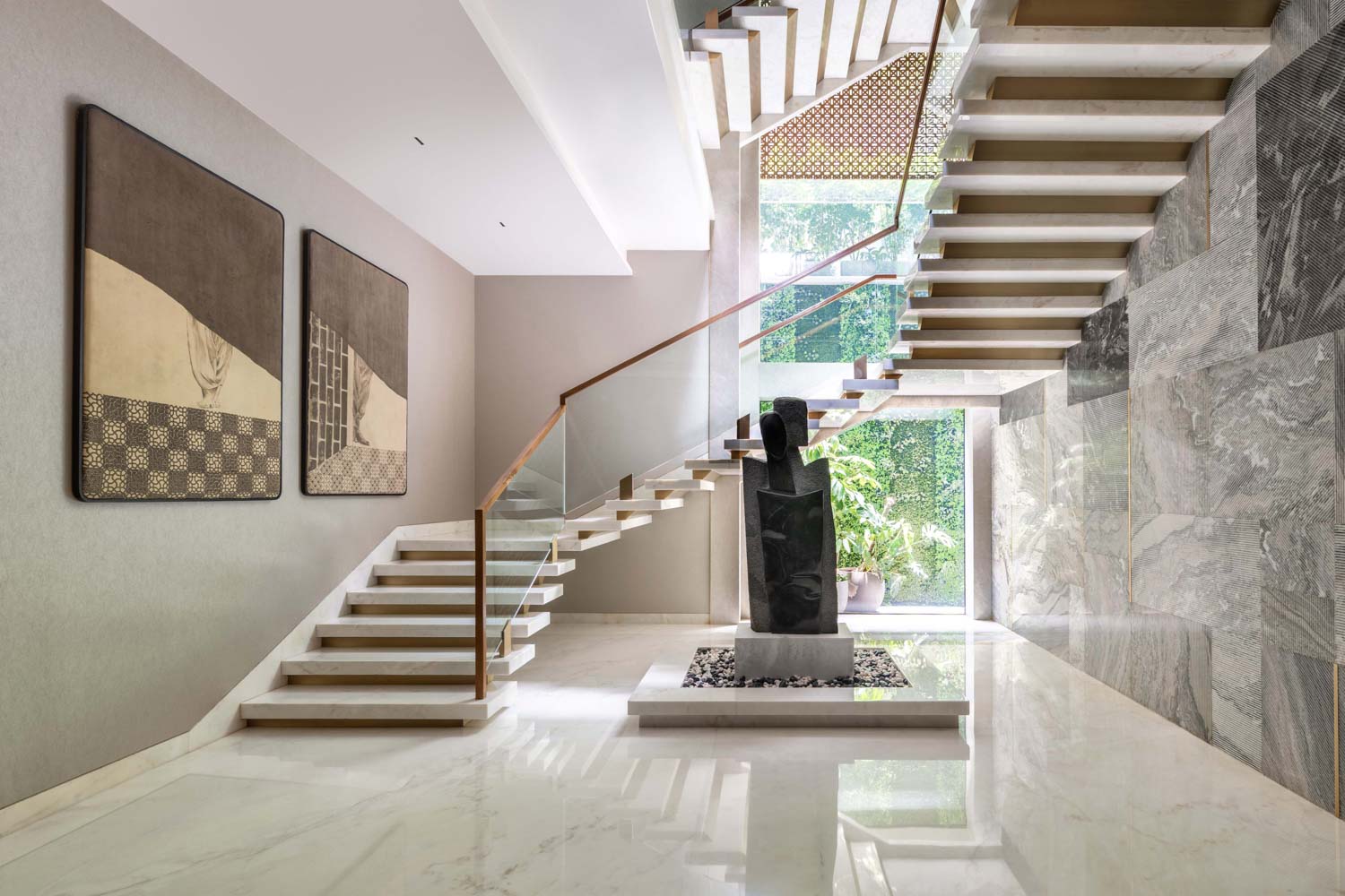 Art and craft are thoughtfully integrated into the architectural journey. A striking canvas by Abhijit Pathak greets visitors at the entry, accompanied by a sculptural bench crafted from recycled materials by Bandana Jain. A carefully curated ascent along the staircase reveals a sequence of artworks, transitioning from Pradeep’s monochromatic sculpture to Deena Pindoria’s ajrakh block prints and concluding with Ashish Shah’s dramatic nazar pattu tapestry. Each intervention enriches the home with narrative and character, transforming circulation spaces into moments of discovery.