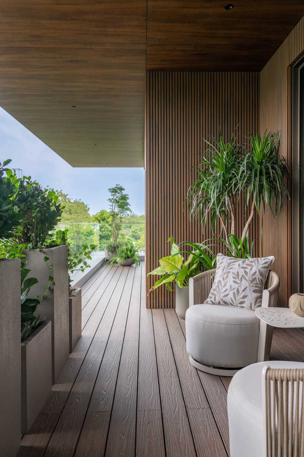 Material expression shapes the atmosphere of the home with quiet sophistication. Grey stone and warm timber define the palette, grounding the structure and creating a tactile depth that is both refined and welcoming. Deep overhangs and textured surfaces temper the tropical climate while establishing a serene resort like ambience. Inside, light grey ash veneer unifies the rooms, and rust toned leather seating on the upper family deck complements the surrounding foliage with a warm counterpoint.