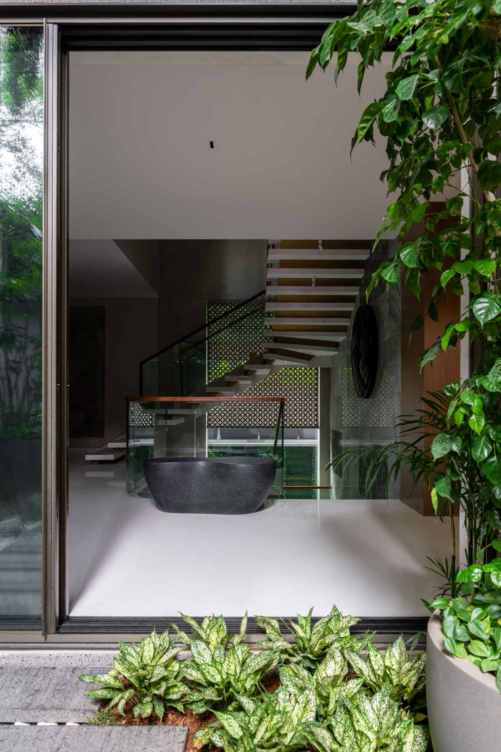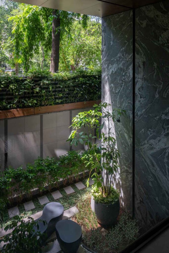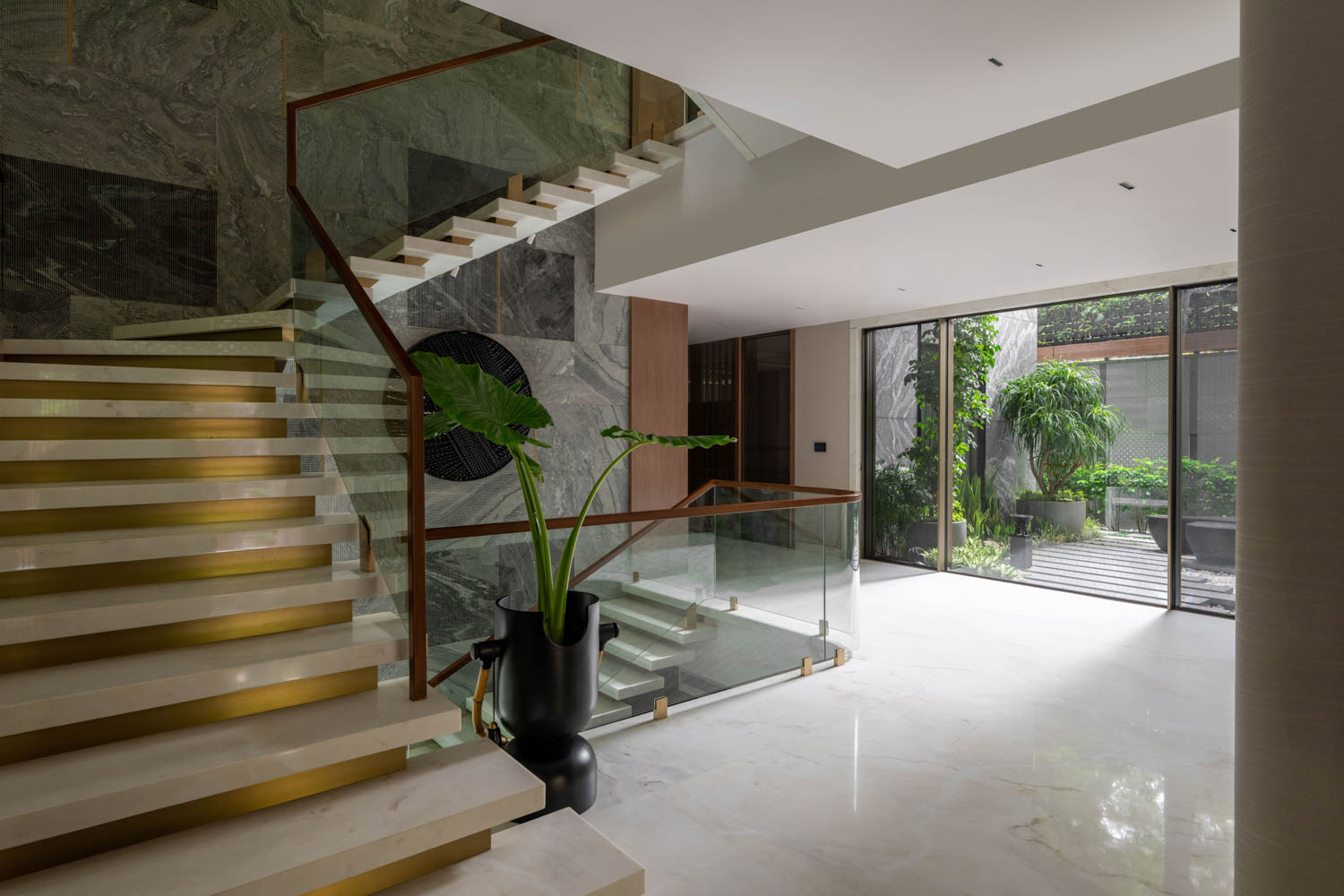 Set within a lush canopy of mature trees in New Delhi, this villa by SEZA Architects offers a serene refuge that thoughtfully reconciles architectural clarity with the quiet rhythms of nature. Designed for a young family of four, the home orchestrates openness, privacy and sustainability through a sensitive spatial narrative that transforms urban living into an experience of calm retreat. At its heart lies a soaring double height courtyard around which the primary living spaces are composed. Every room opens outward to both this central volume and to the gardens at the front and rear of the site, allowing daylight, greenery, and movement to flow in a continuous loop. A linear internal light well introduces natural light deep into the basement lounge, ensuring even secluded spaces remain warm, luminous and connected.