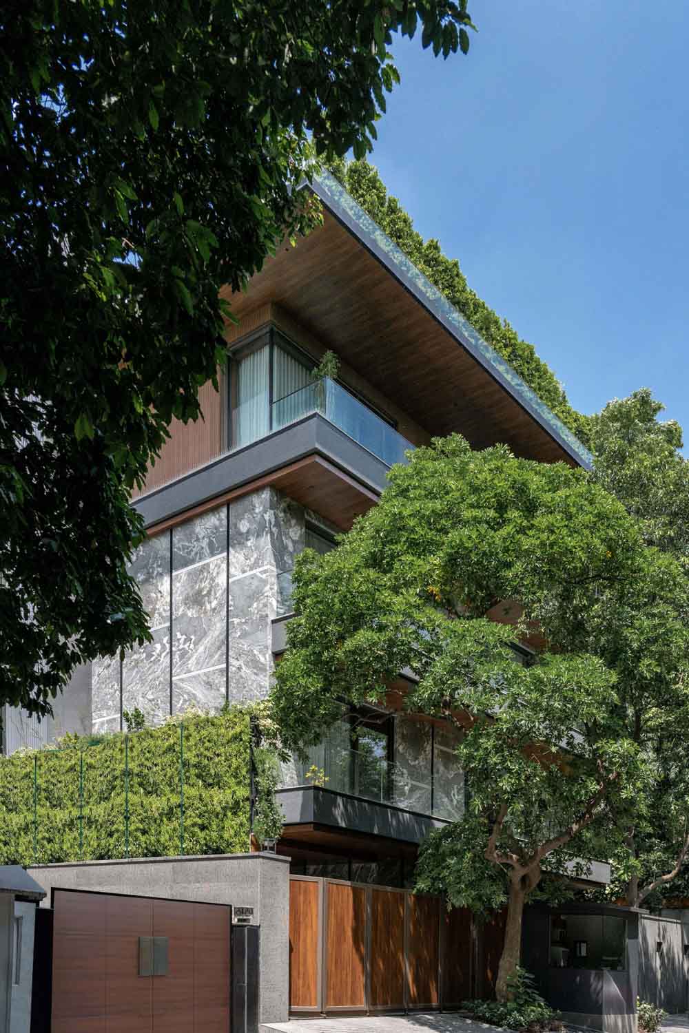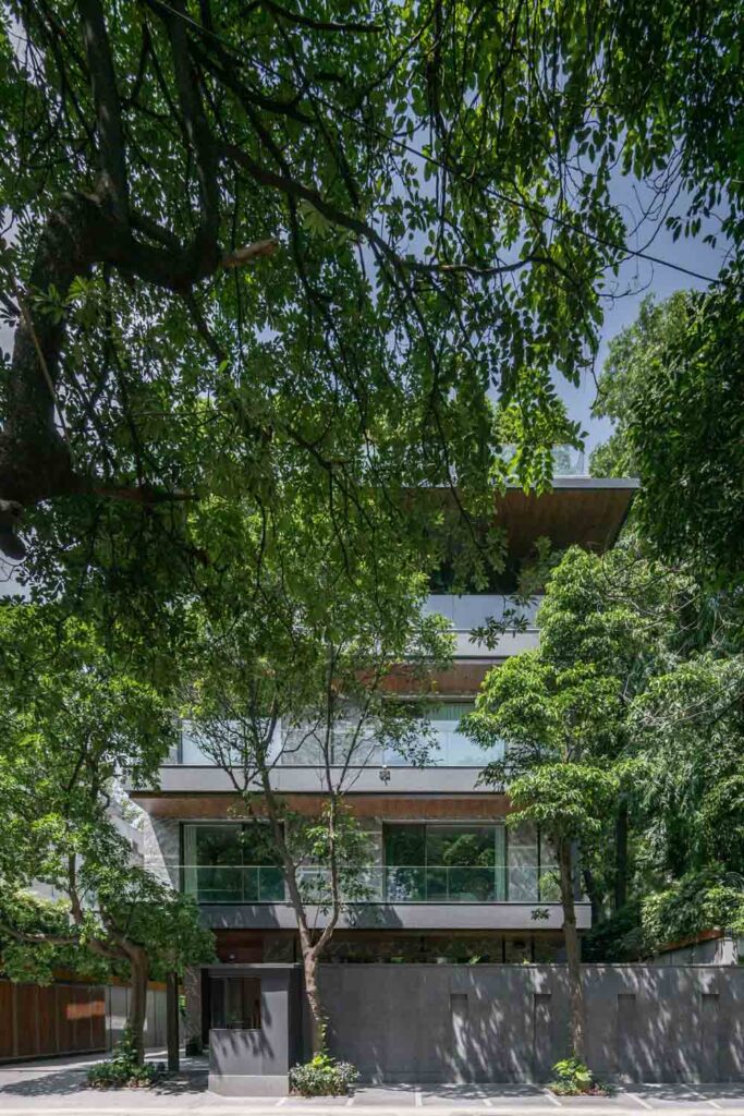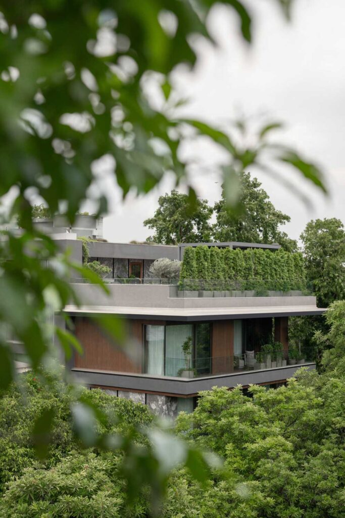 The spatial organisation unfolds vertically with a clear hierarchy. Private bedrooms occupy the first and second floors, each configured as an independent living unit with its own lounge and terrace. The structure steps back as it rises, enabling generous cantilevered decks and sculptural roof projections that shield the facade while lending dynamic form to the exterior. These cascading terraces frame uninterrupted views of treetops and sky, crafting personal outdoor extensions that preserve intimacy and soften the boundary between built form and landscape.