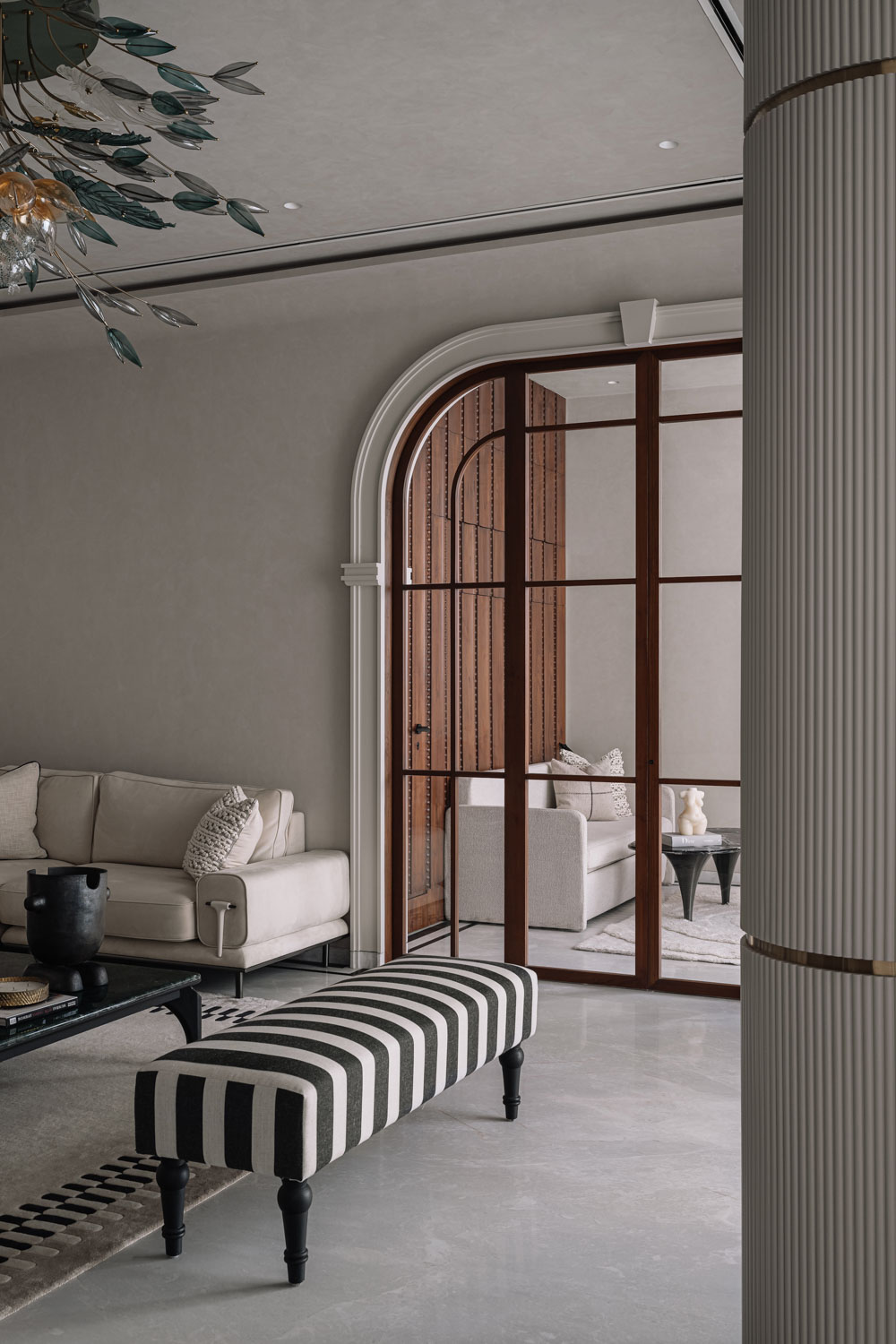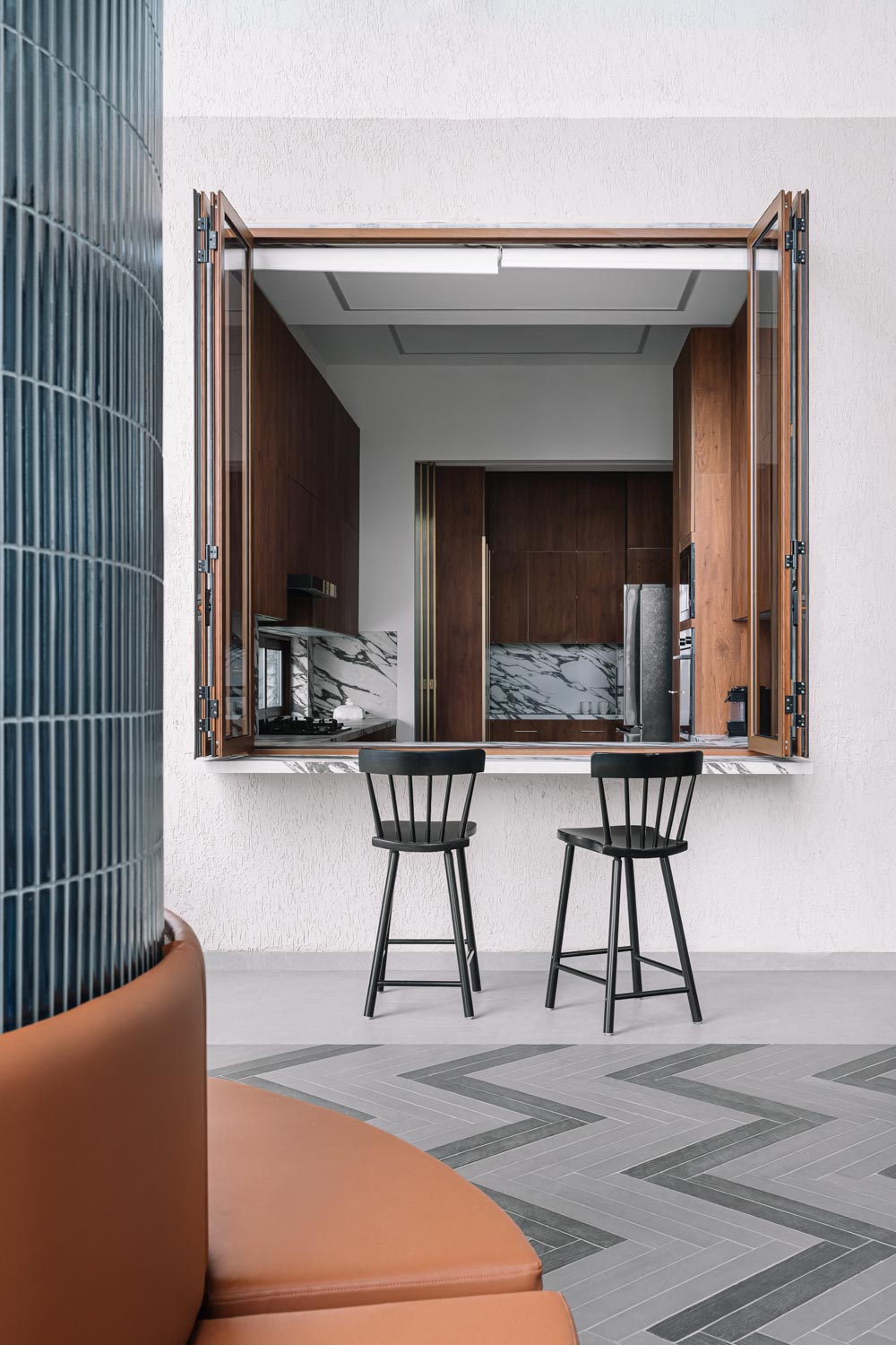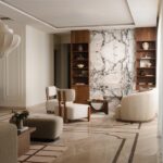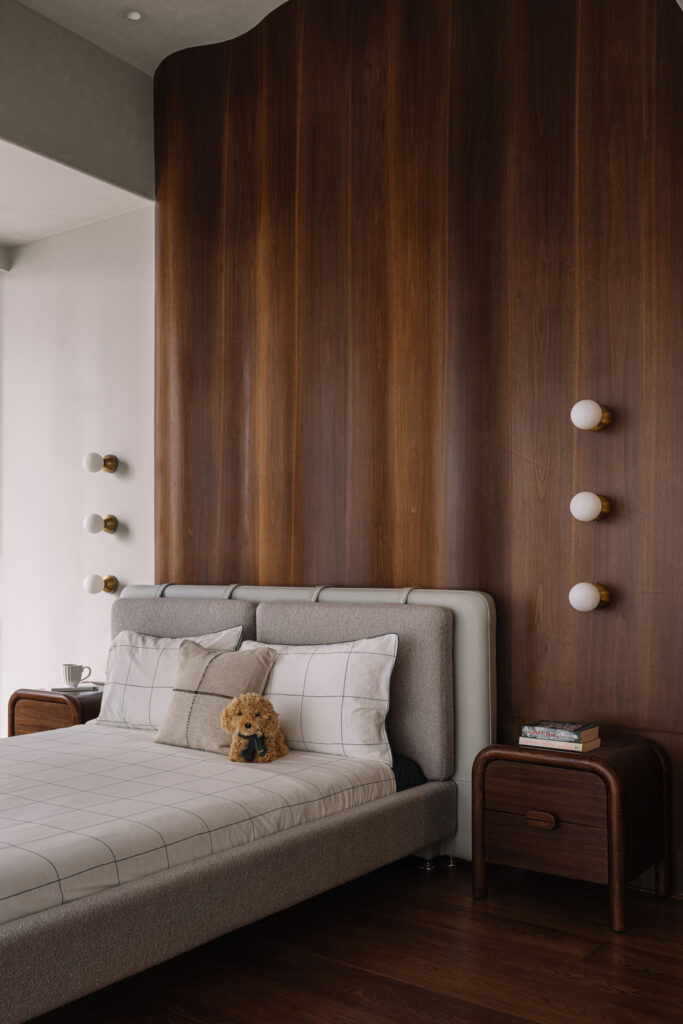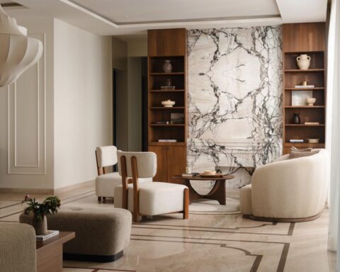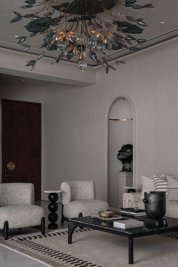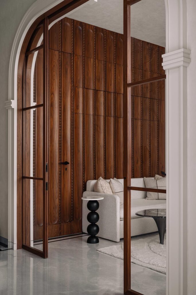 Within the living zone, a multipurpose den is seamlessly integrated. Though visually connected, it can be fully enclosed when required. A concealed Murphy bed is tucked within panelled walls, allowing the room to transform effortlessly into a guest bedroom without disrupting the visual continuity of the space. This adaptability reflects the studio’s thoughtful layering of function within a refined architectural framework.