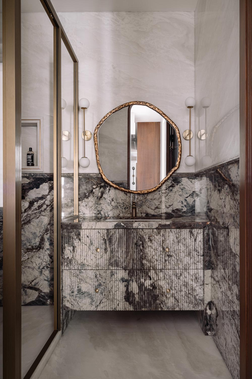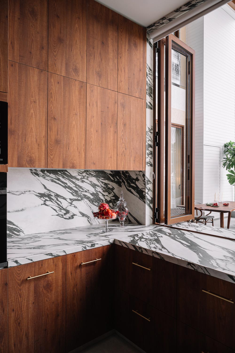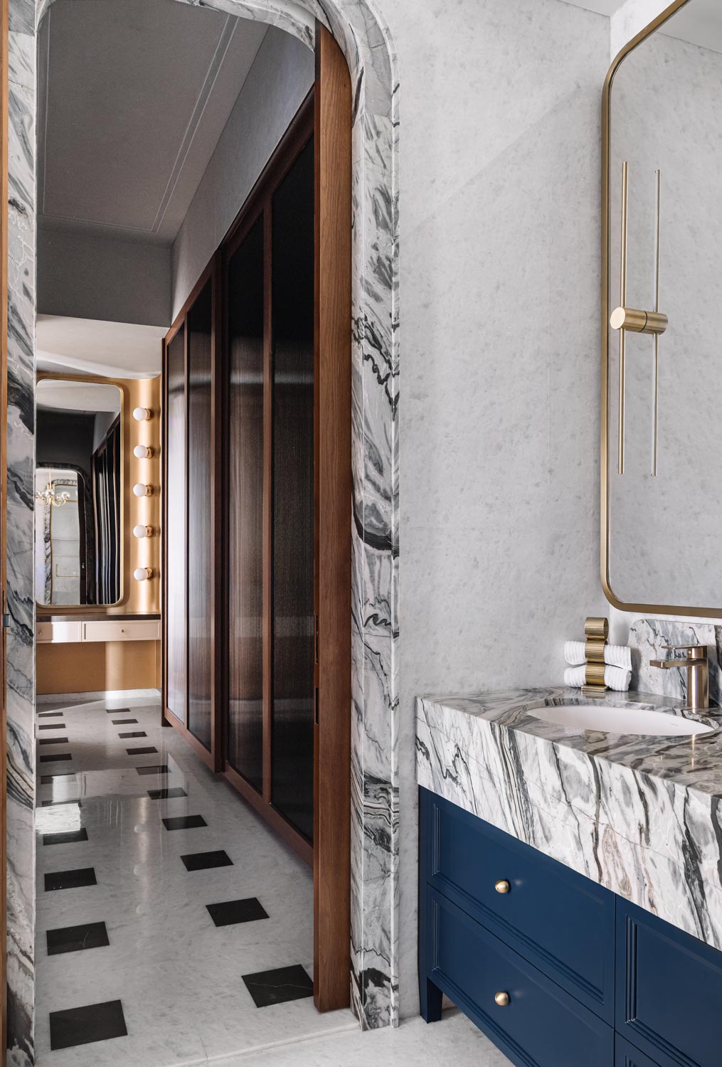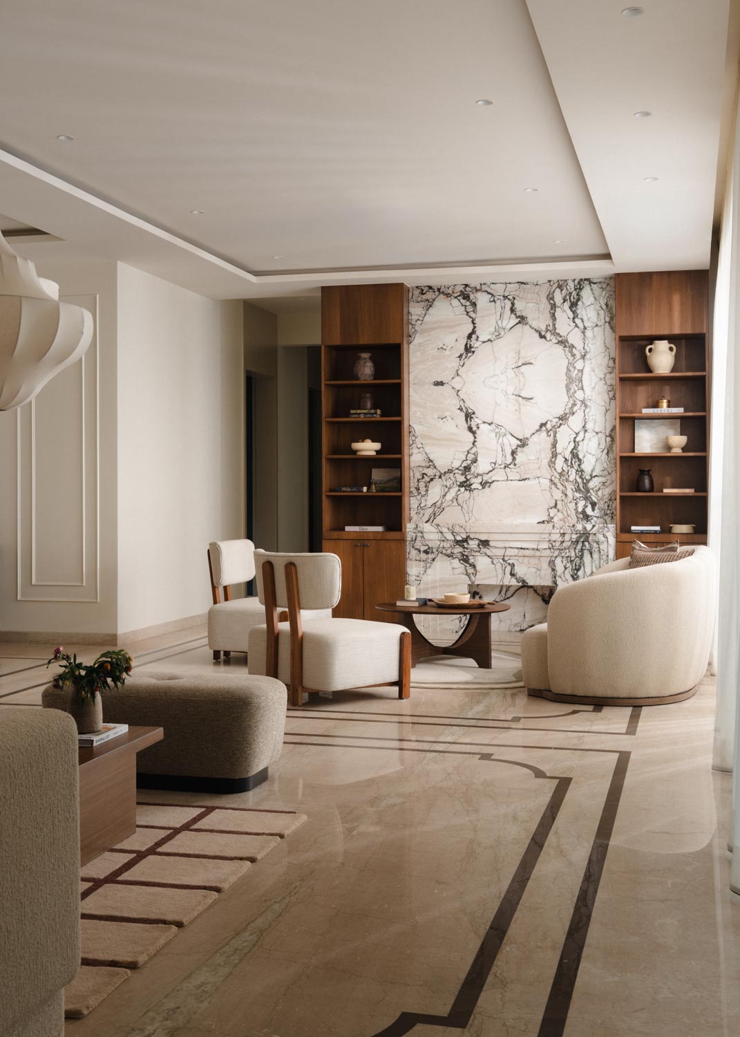 Within the living zone, a multipurpose den is seamlessly integrated. Though visually connected, it can be fully enclosed when required. A concealed Murphy bed is tucked within panelled walls, allowing the room to transform effortlessly into a guest bedroom without disrupting the visual continuity of the space. This adaptability reflects the studio’s thoughtful layering of function within a refined architectural framework.