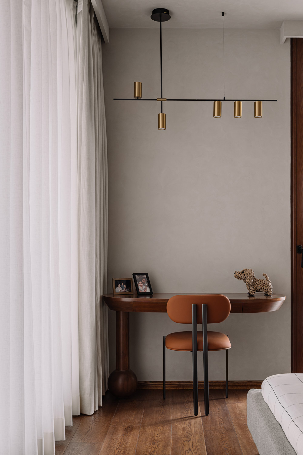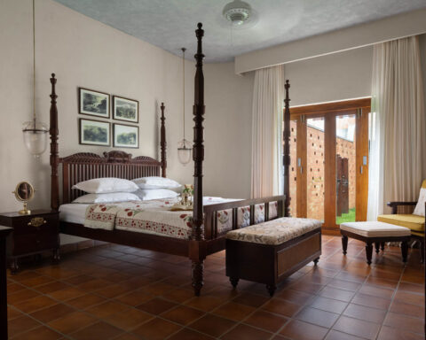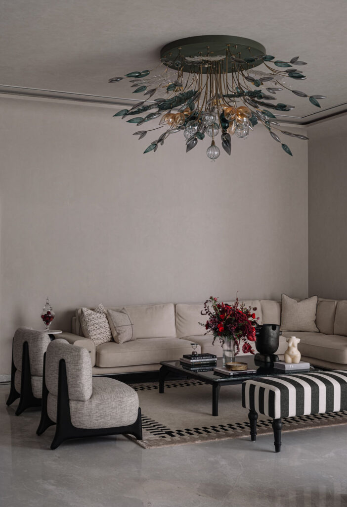Furniture and lighting selections reinforce the home’s understated elegance. Pieces sourced from Blueloft, Objectry, Sarita Handa, Solid Bench, Soisu, and Waulte strike a balance between comfort and craftsmanship. Lighting from Glass Forest, Artemis, Stem Lights, and Length Breadth Height washes the textured surfaces in a warm, ambient glow. Artworks by Abhay Sehgal and Kapil Anant animate the walls with subtle vibrancy, while greenery curated by Studio Palasa and Sparrow Nursery introduces a gentle biophilic presence.