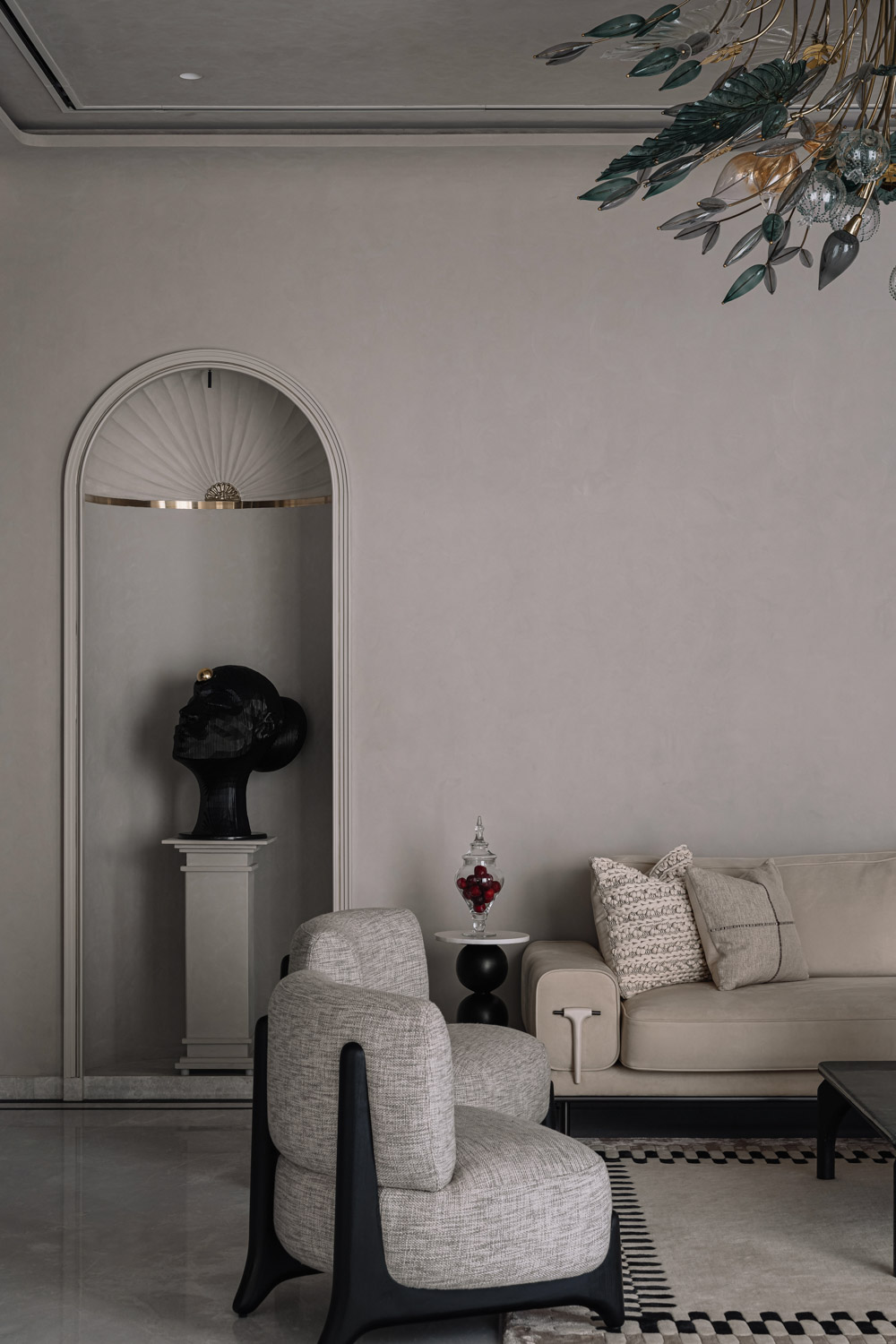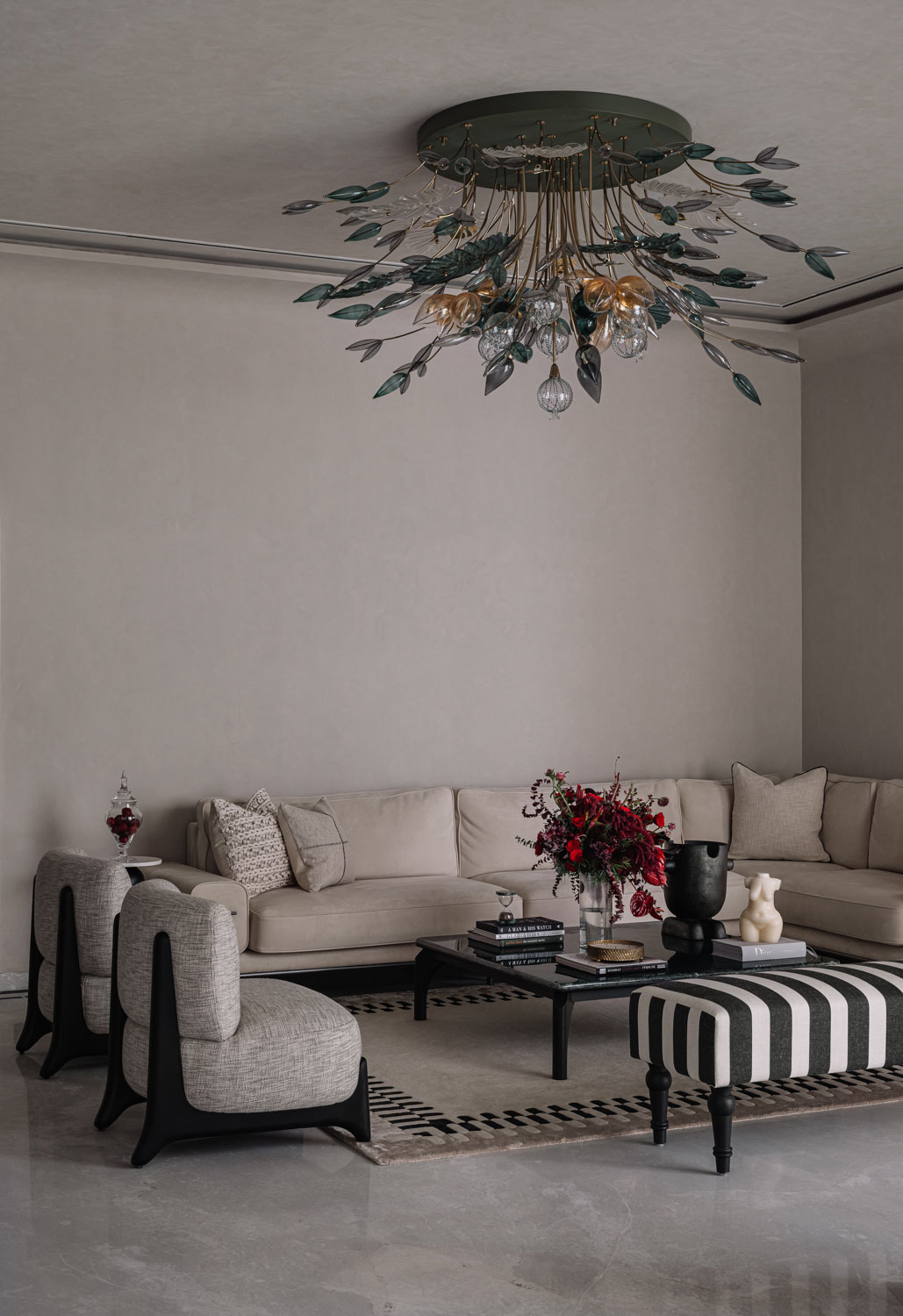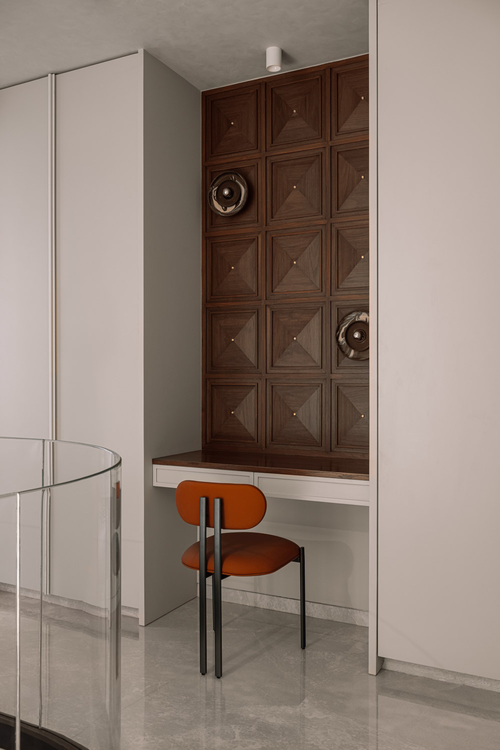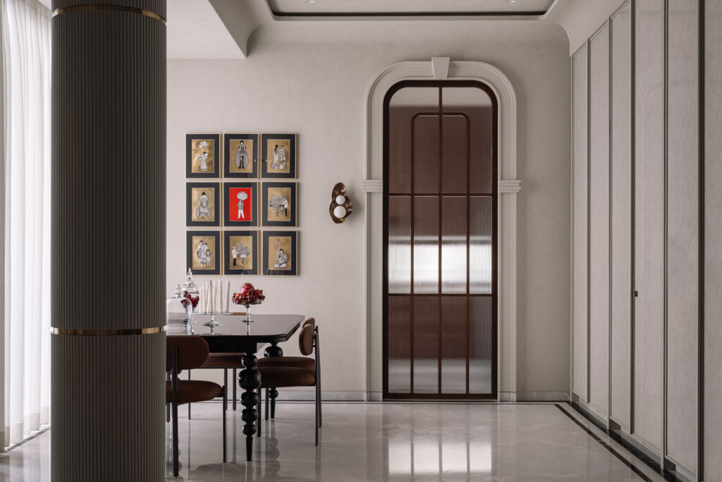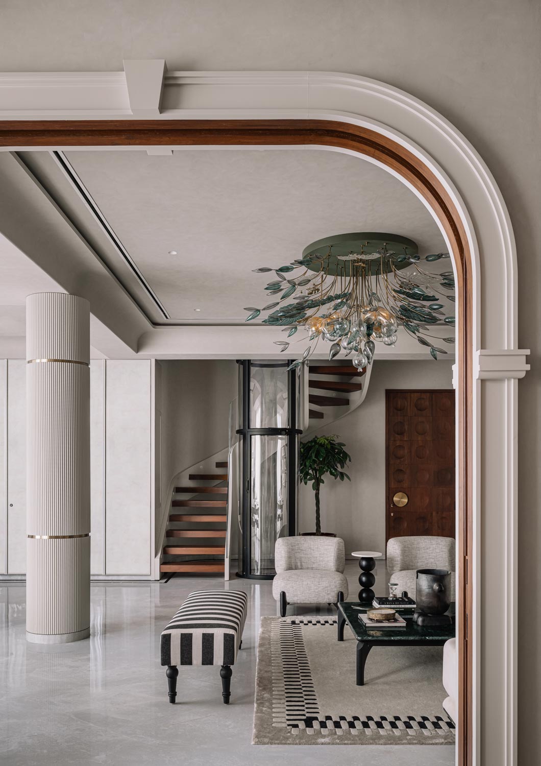 The staircase itself is a defining architectural feature. Finished in PU and edged with a glass railing, it curves gracefully around a capsule elevator that rises as a transparent column through the duplex. This vertical interplay of solid and glass introduces both drama and practicality, ensuring ease of access while contributing to the spatial narrative.
