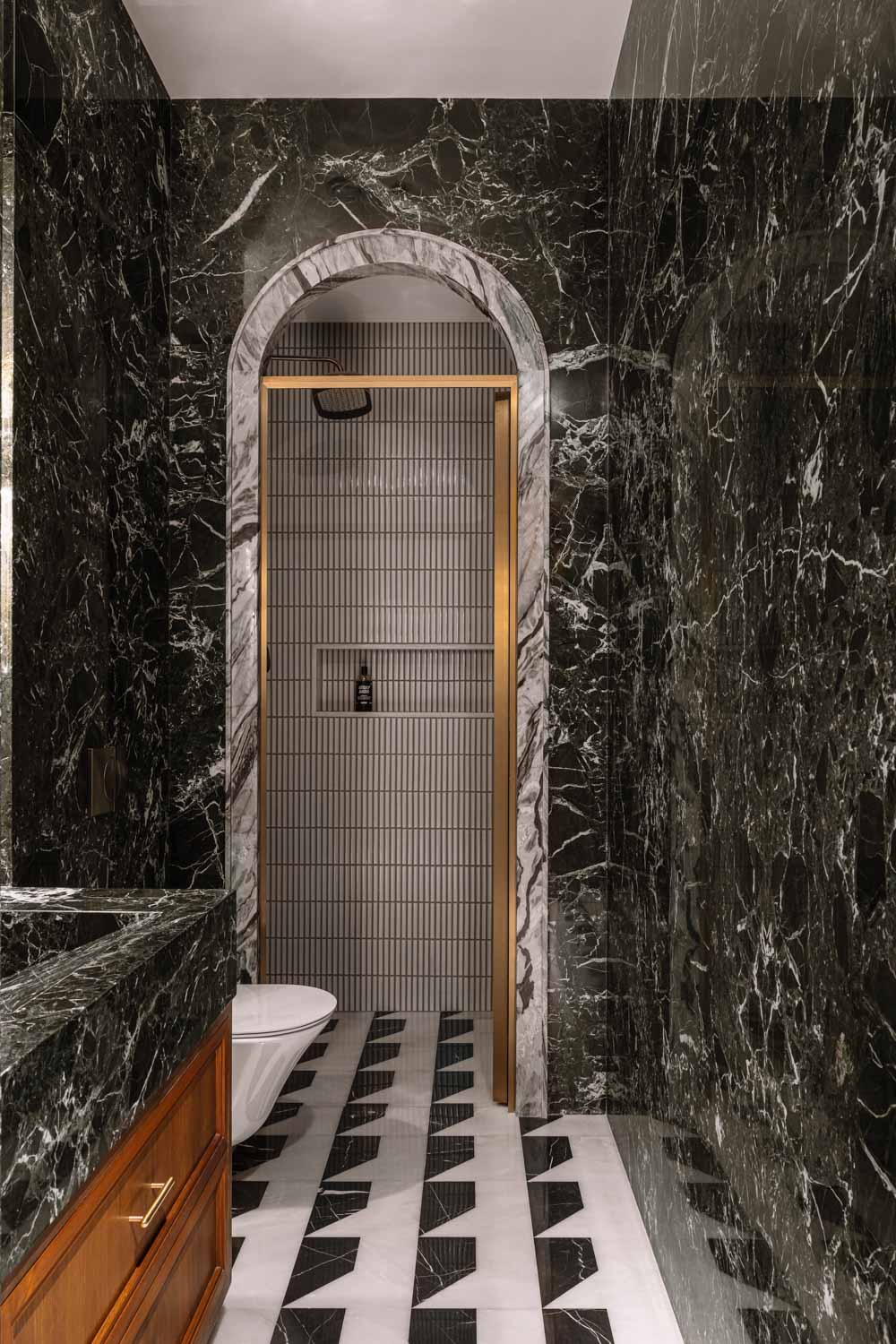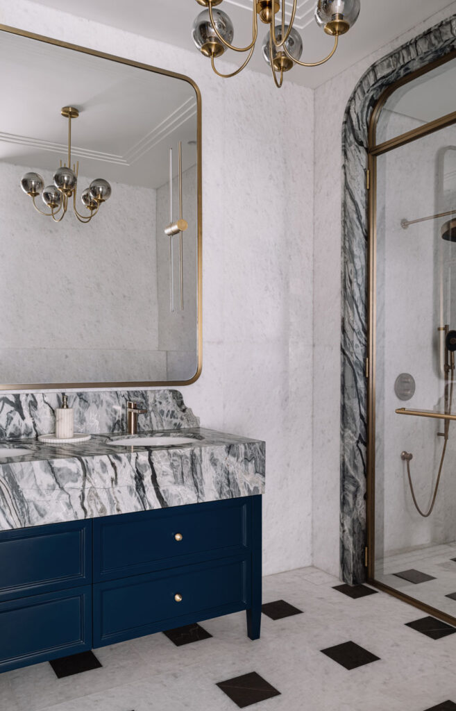 The upper level is dedicated to privacy and retreat. Two expansive bedroom suites each feature their own walk in wardrobes and indulgent bathrooms. The master suite is distinguished by parquet flooring in deep wood tones that introduce warmth and intimacy. Bathrooms throughout the home are clad in richly veined marble and patterned floors inspired by English design traditions, creating spaces that feel tactile and contemplative rather than merely utilitarian.