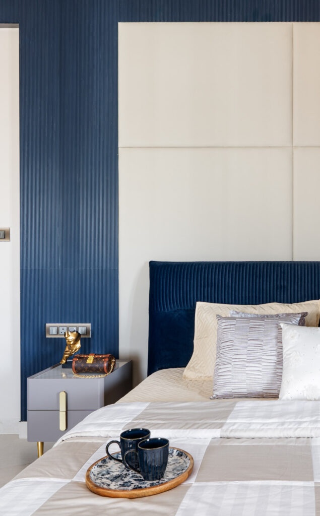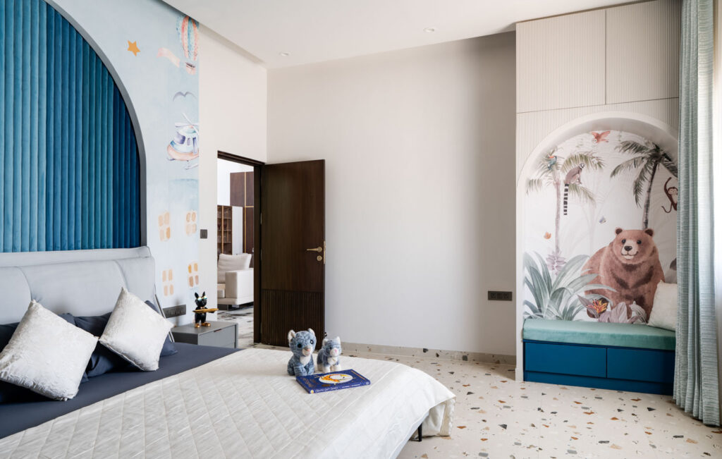 The bedrooms continue the narrative with lightness and intention. The master suite offers a calm retreat, layered with floral wallpapers, leather panelling, and blue fluted accents that create intimacy without visual fatigue. The children’s bedroom embraces imagination, with suede fluted arches, aviation inspired wallpaper, and a cosy jungle themed nook that invites exploration and play.