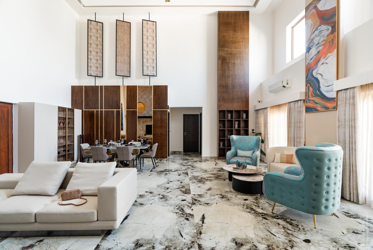 The dining area forms the emotional heart of the double height core. A tall fabric panelled wall rises behind the dining table, angled within sleek metal frames that lend quiet drama. Anchoring the space is an exotic blue marble dining table, its rich veining echoing the tones of the artwork nearby. Grey dining chairs with slit backs and leather detailing complete the setting with understated sophistication. Here, scale, texture, and tone come together in carefully curated balance.