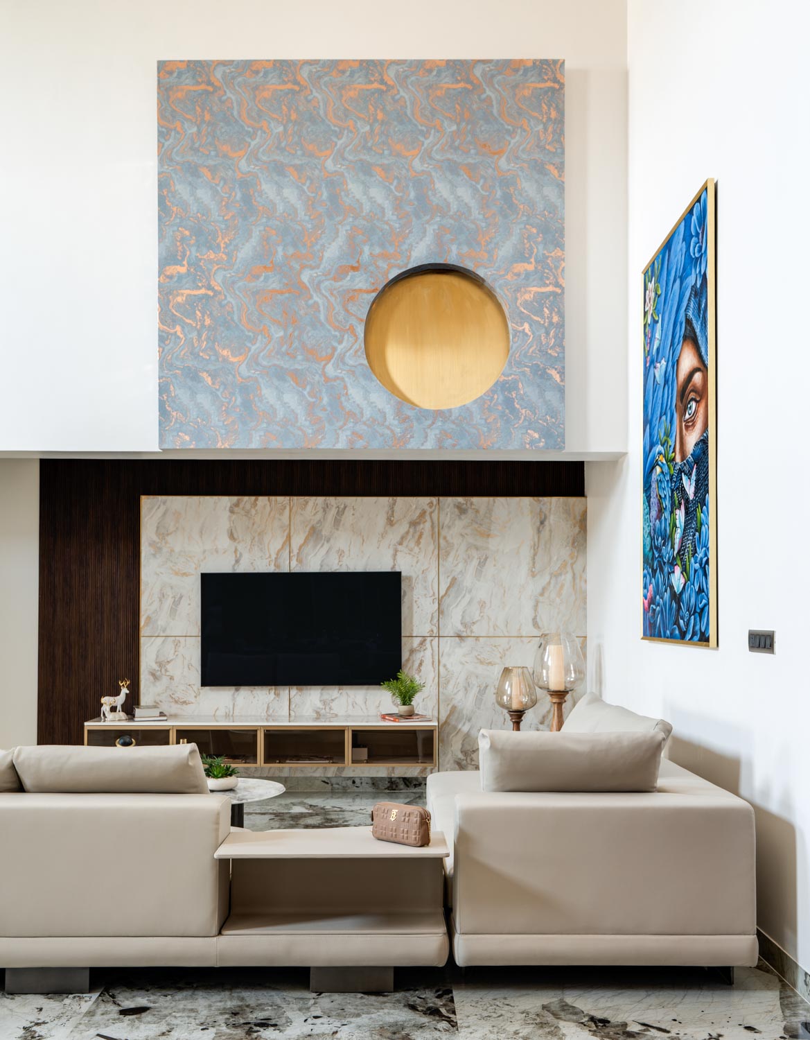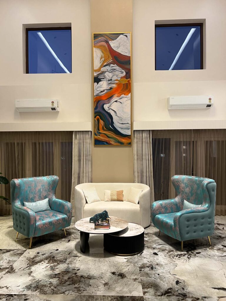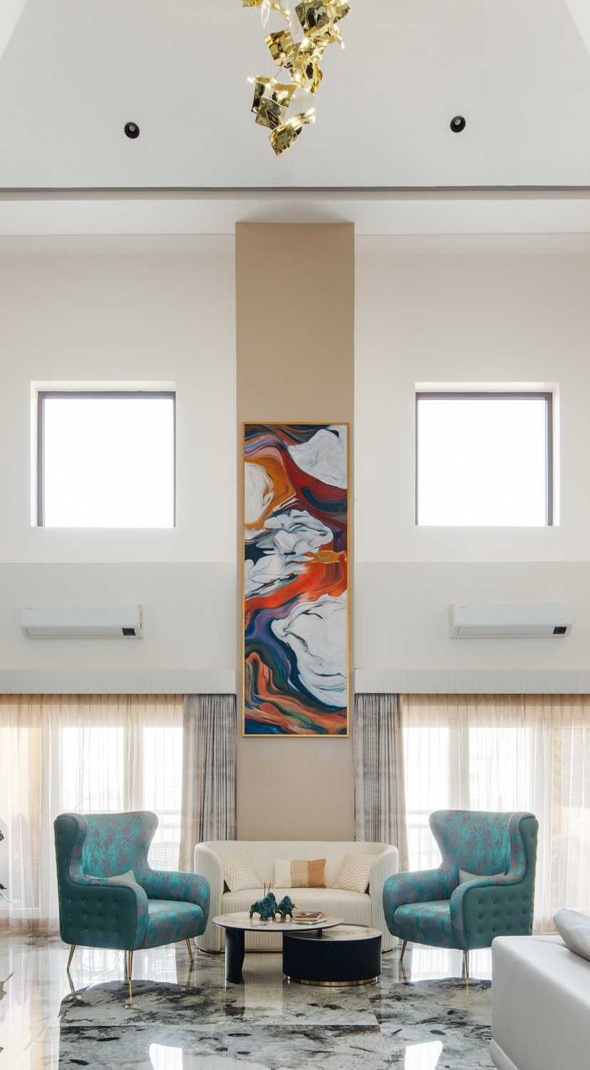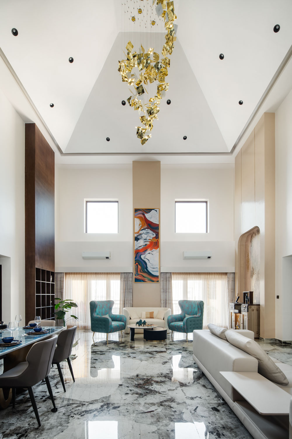 The arrival experience is intentionally cinematic. A dramatic double height volume is crowned by a four sided pitched ceiling, each plane articulated subtly to create a sense of movement and scale. Cutting across this soaring space is a beam that refuses anonymity. Rather than being concealed, it is celebrated as sculpture, clad in foiled wallpaper and embellished with a custom metal art installation. Suspended beneath it, a bespoke chandelier cascades like rainfall in gold toned finesse, anchoring the vertical expanse with elegance rather than excess. The result is a space that feels theatrical yet composed, expressive without ever being loud.