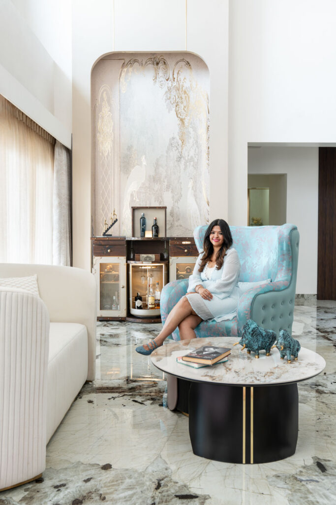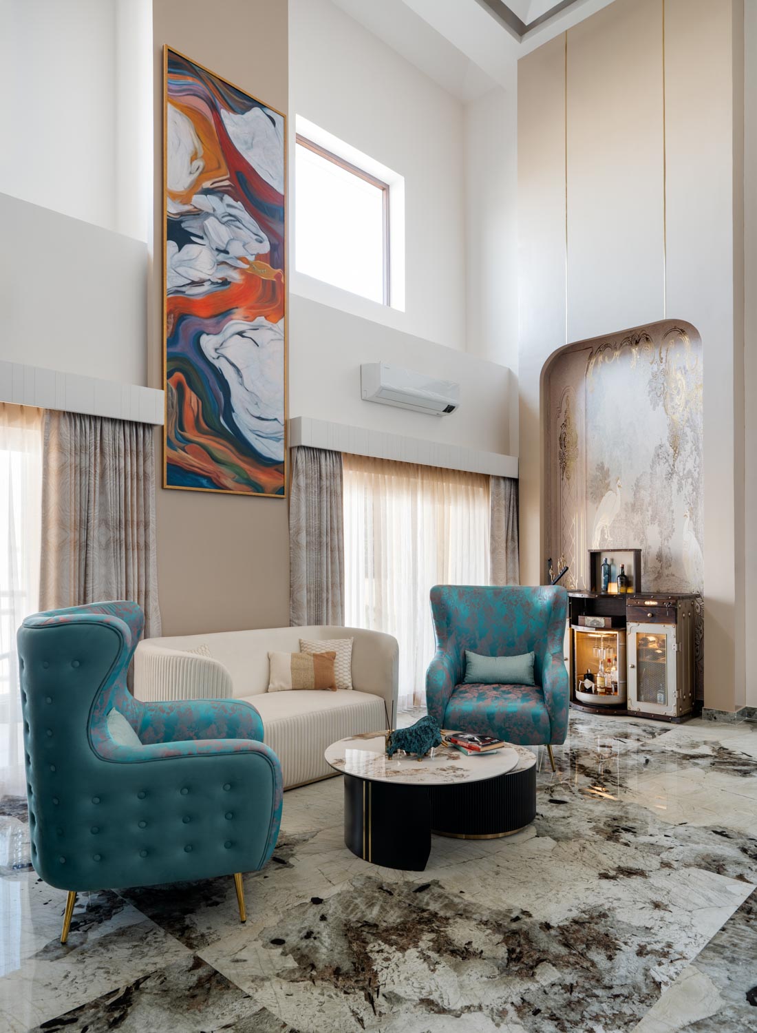 Across the living and family areas, a tone on tone language unfolds. Marble topped centre tables reflect the Patagonian white flooring, reinforcing continuity throughout the space. On one side, a veneered display unit houses crystal artefacts, while opposite, a playful bar nook comes alive with custom peacock motif wallpaper and an embroidered teal accent chair. These moments introduce personality and heritage, interpreted through a contemporary lens.