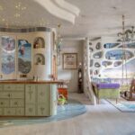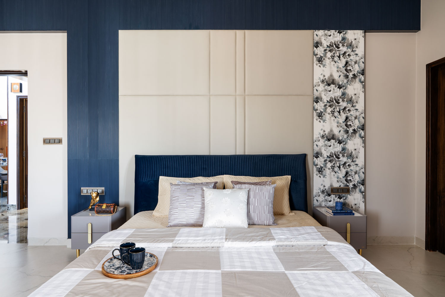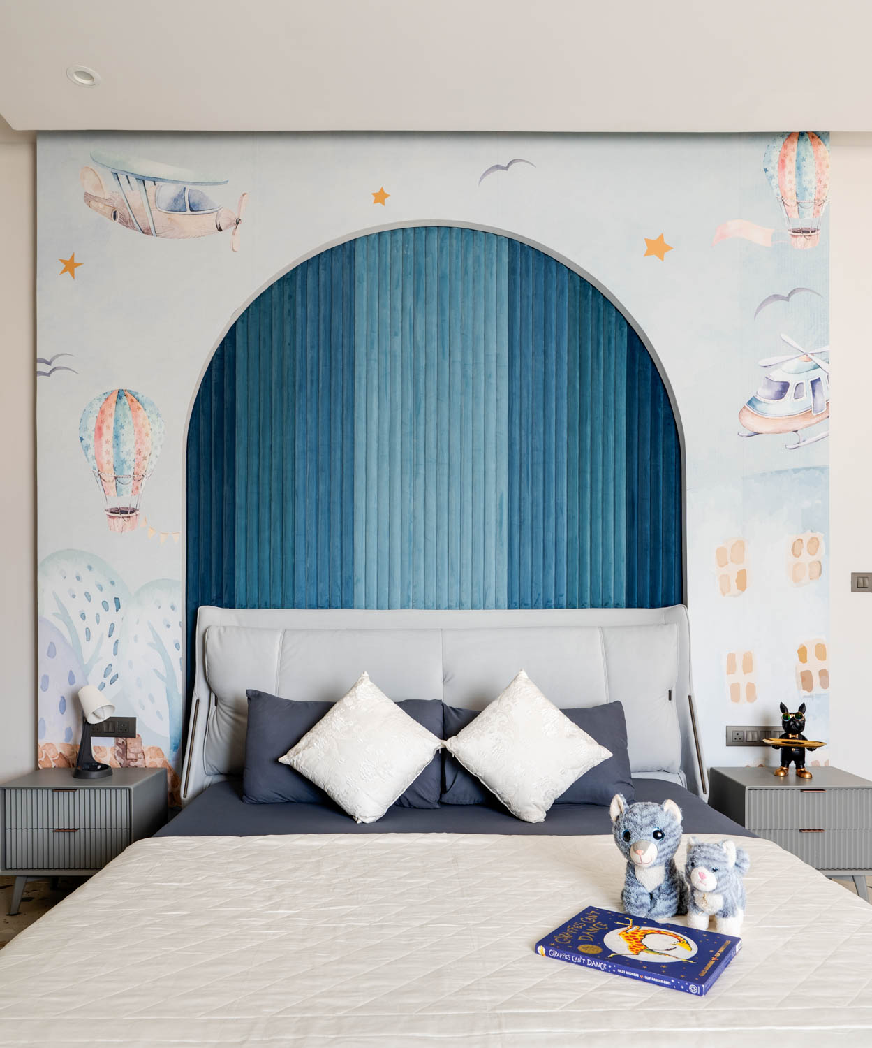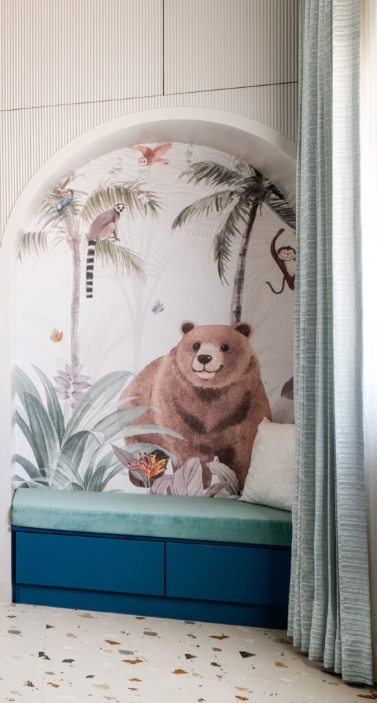 The bedrooms continue the narrative with lightness and intention. The master suite offers a calm retreat, layered with floral wallpapers, leather panelling, and blue fluted accents that create intimacy without visual fatigue. The children’s bedroom embraces imagination, with suede fluted arches, aviation inspired wallpaper, and a cosy jungle themed nook that invites exploration and play.