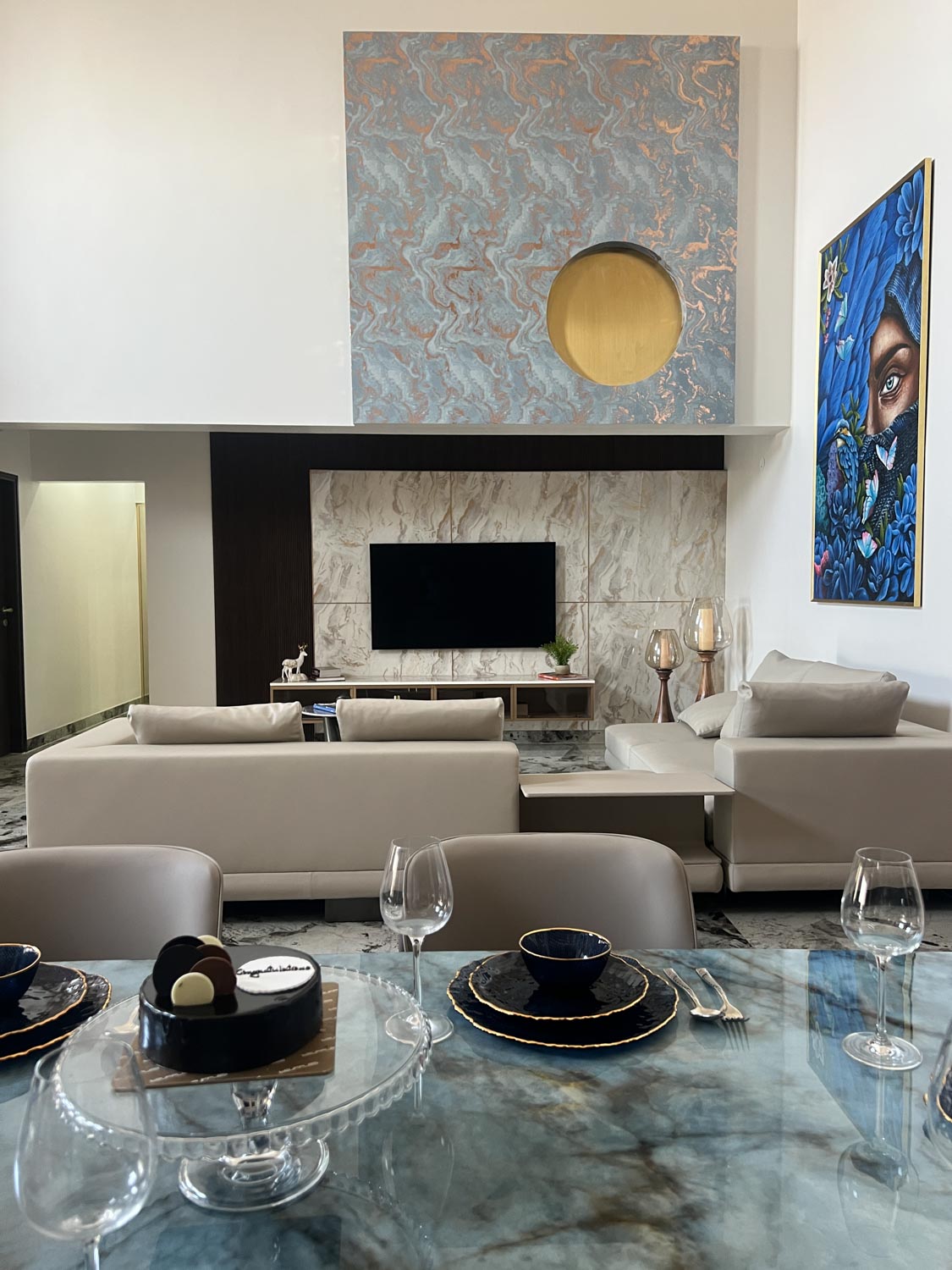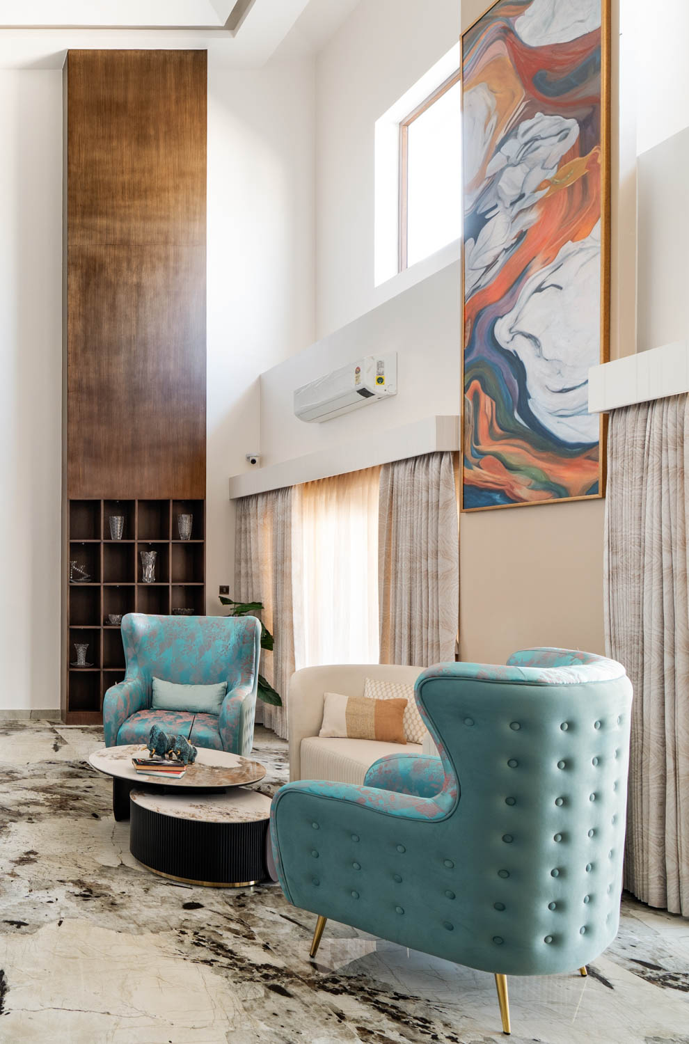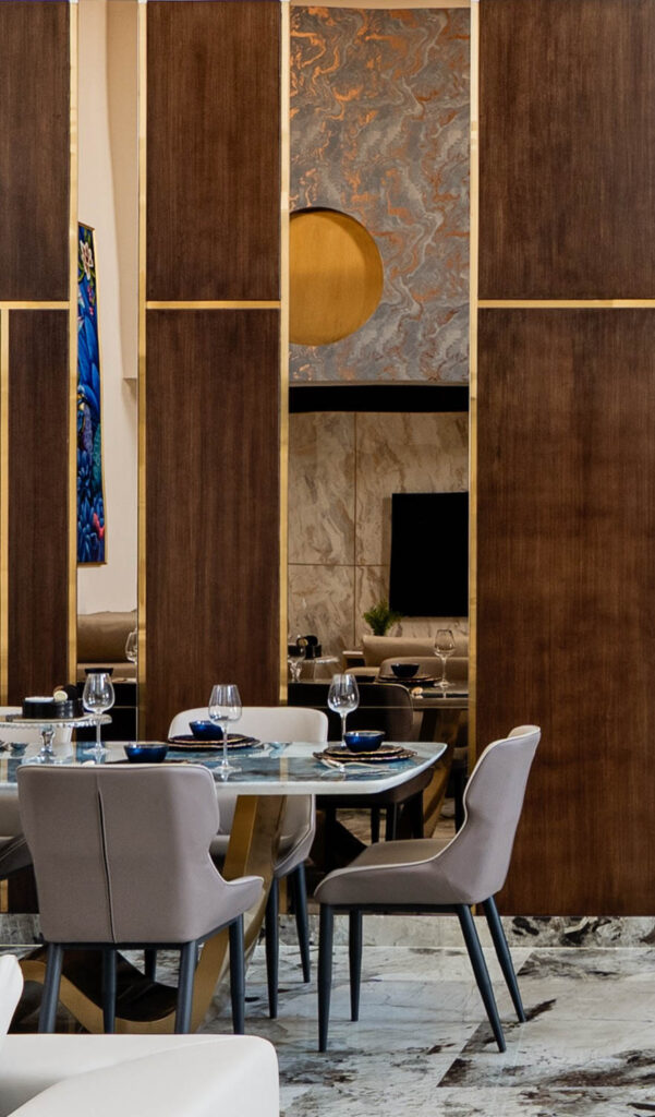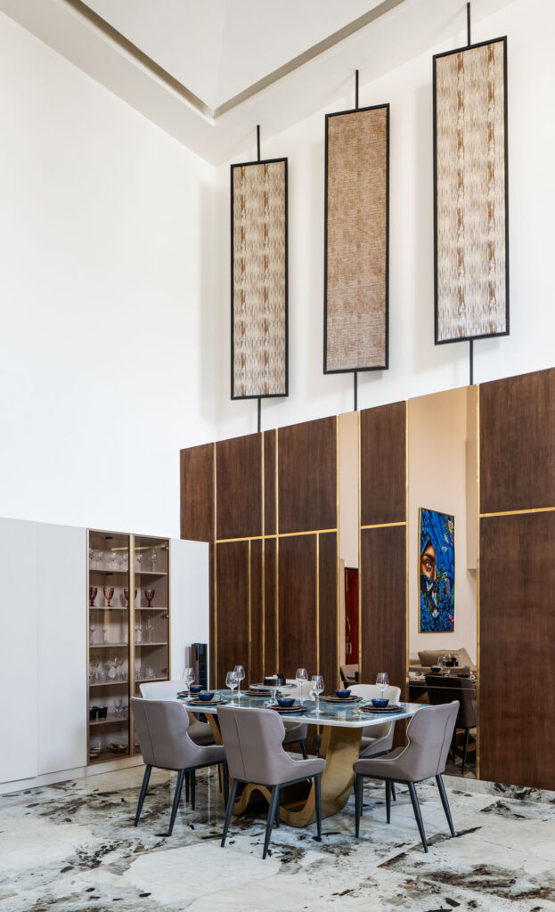 The dining area forms the emotional heart of the double height core. A tall fabric panelled wall rises behind the dining table, angled within sleek metal frames that lend quiet drama. Anchoring the space is an exotic blue marble dining table, its rich veining echoing the tones of the artwork nearby. Grey dining chairs with slit backs and leather detailing complete the setting with understated sophistication. Here, scale, texture, and tone come together in carefully curated balance.