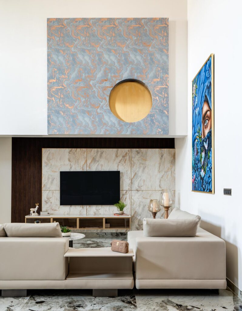 In the adjoining family lounge, a striking cobalt blue artwork introduces a moment of graphic intensity. Set against patterned wallpaper and a circular sculptural feature, it brings contemporary energy into an otherwise tonal palette. This controlled contrast speaks to the home’s design maturity, where moments of disruption are intentional and precisely placed.