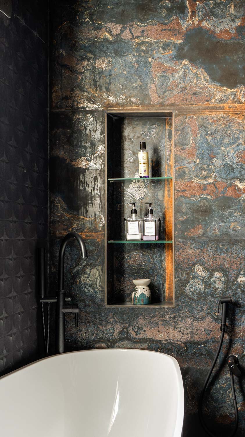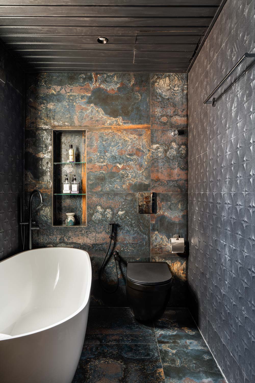 Beyond its visual richness, Renaissance excels in spatial performance. The kitchen, once an awkward and inefficient corner, has been transformed into a refined and highly functional workspace. Fluted glass shutters, glazed tile backsplashes, and ergonomic fittings come together to anticipate daily use with elegance. The powder room evolves into a tactile retreat, wrapped in deep rustic blue tones and elevated by a freestanding bathtub that transforms a utilitarian space into a sensory experience.