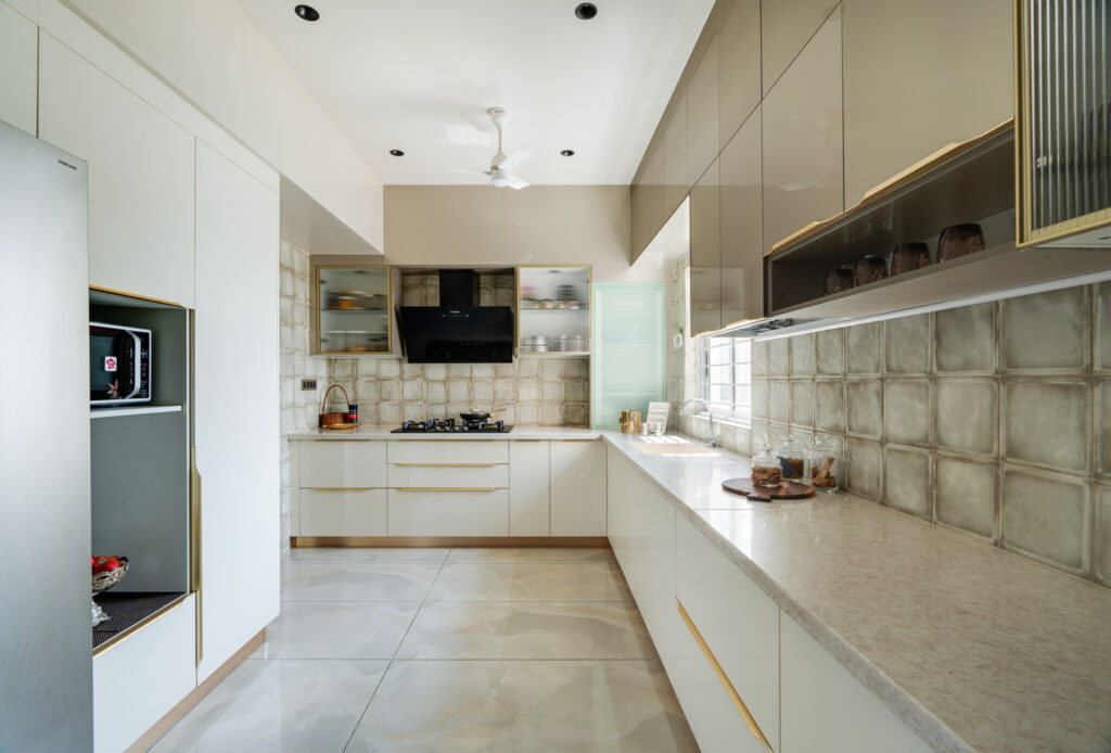 Spiritual spaces are approached with equal restraint. The puja room is seamlessly integrated into the plan, articulated through tinted brown glass shutters, onyx surfaces, and textured finishes. Tradition here is expressed softly, without visual weight or overt symbolism.